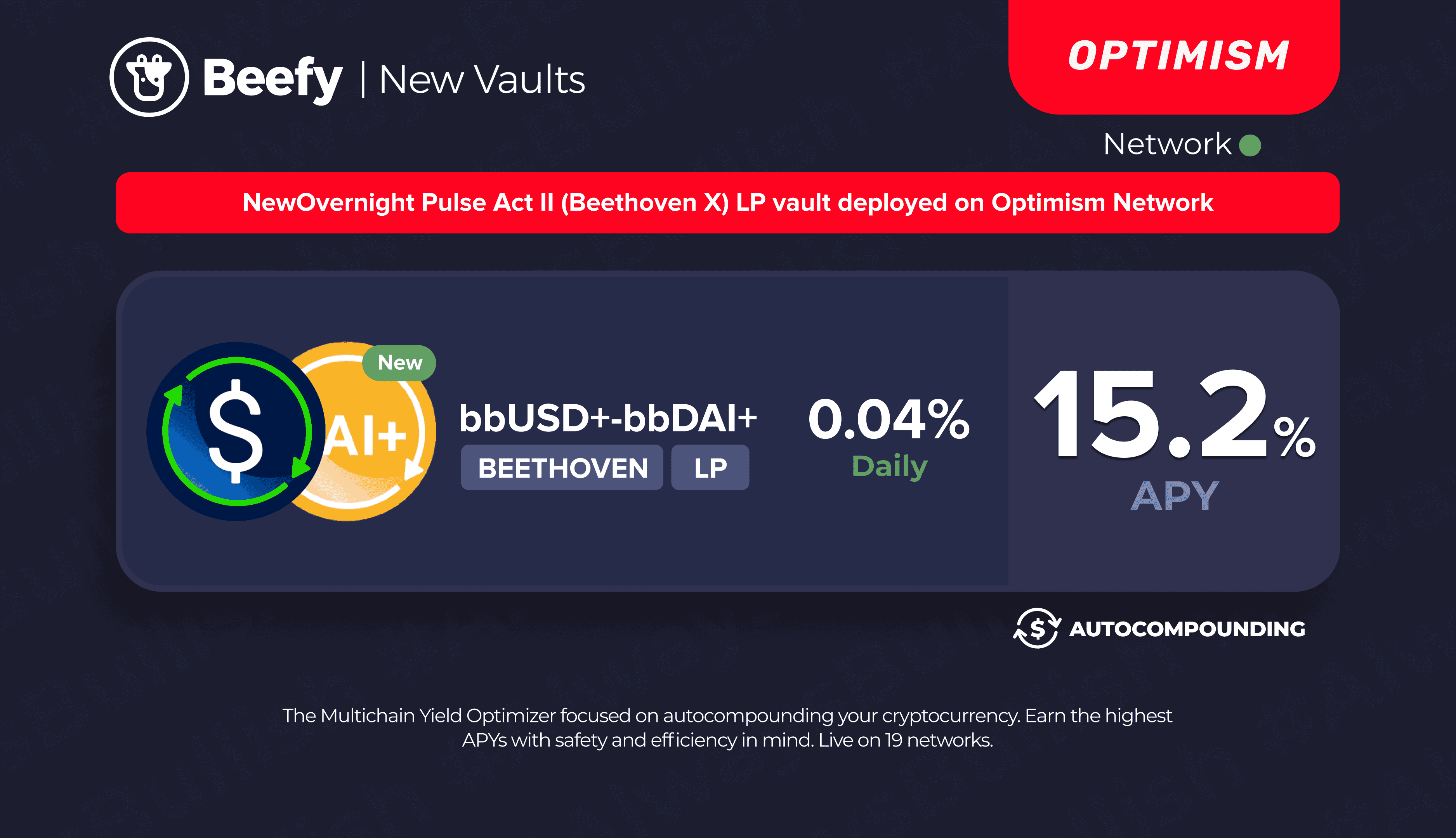 To celebrate the progress of $USD+ and our impressive range of Overnight vaults, we’re hosting a launchpool boost on our Overnight Pulse Act II Vault over the next four weeks. As part of the celebration, you can earn boosted $OP rewards throughout. To participate in the boost, simply enter the vault and stake your mooTokens in the “Boost” section on the vault page.
