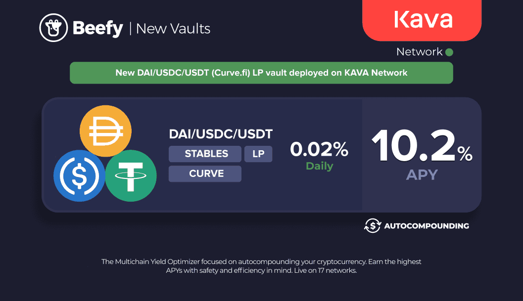 Kava is currently home to some of the most recognized names in DeFi: Curve and SushiSwap, and now, Beefy. Beefy has launched the Curve 3pool Vault (USDC/USDT/DAI) and also has a range of SushiSwap Vaults to stake in.