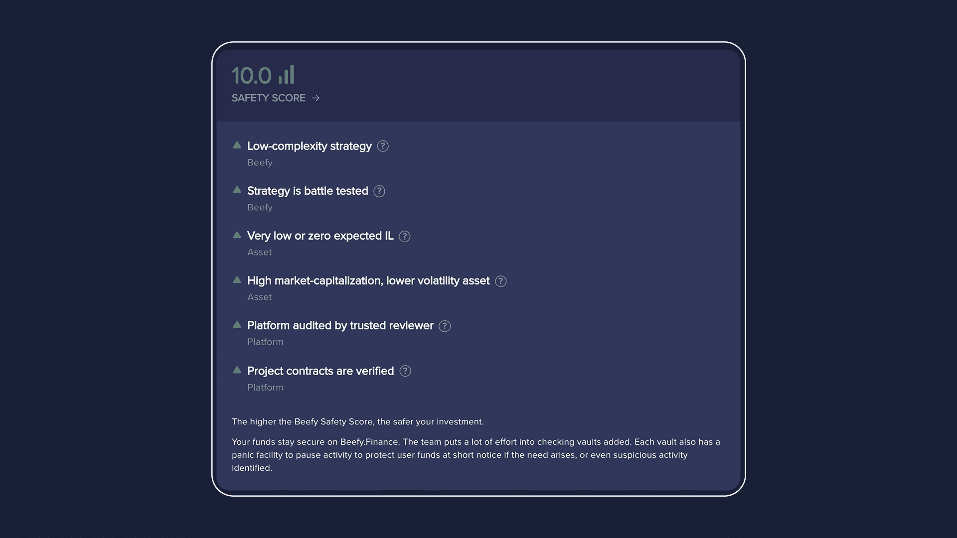 Each vault shows a detailed breakdown of the Safety Score computed by Beefy’s developers during their strategy assessment. No score can capture risk levels perfectly, but Beefy finds it a useful gauge in making decisions. The Safety Score ranks a vault from 0 (the worst) to 10 (the best).