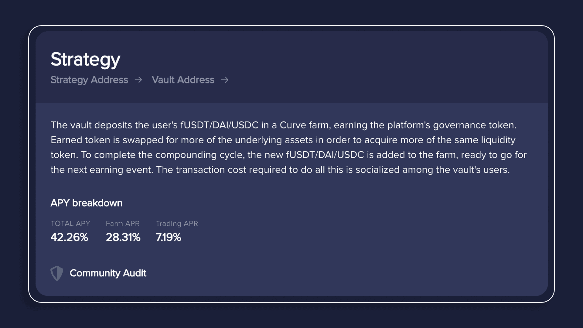 A vault’s strategy description explains what happens at the smart contract level with deposited funds. You can easily understand where all user assets are deposited, what gets earned, and how the APY is generated. You’ll also find links here to the strategy and vault’s contract address, as well as available audits for the underlying platform.