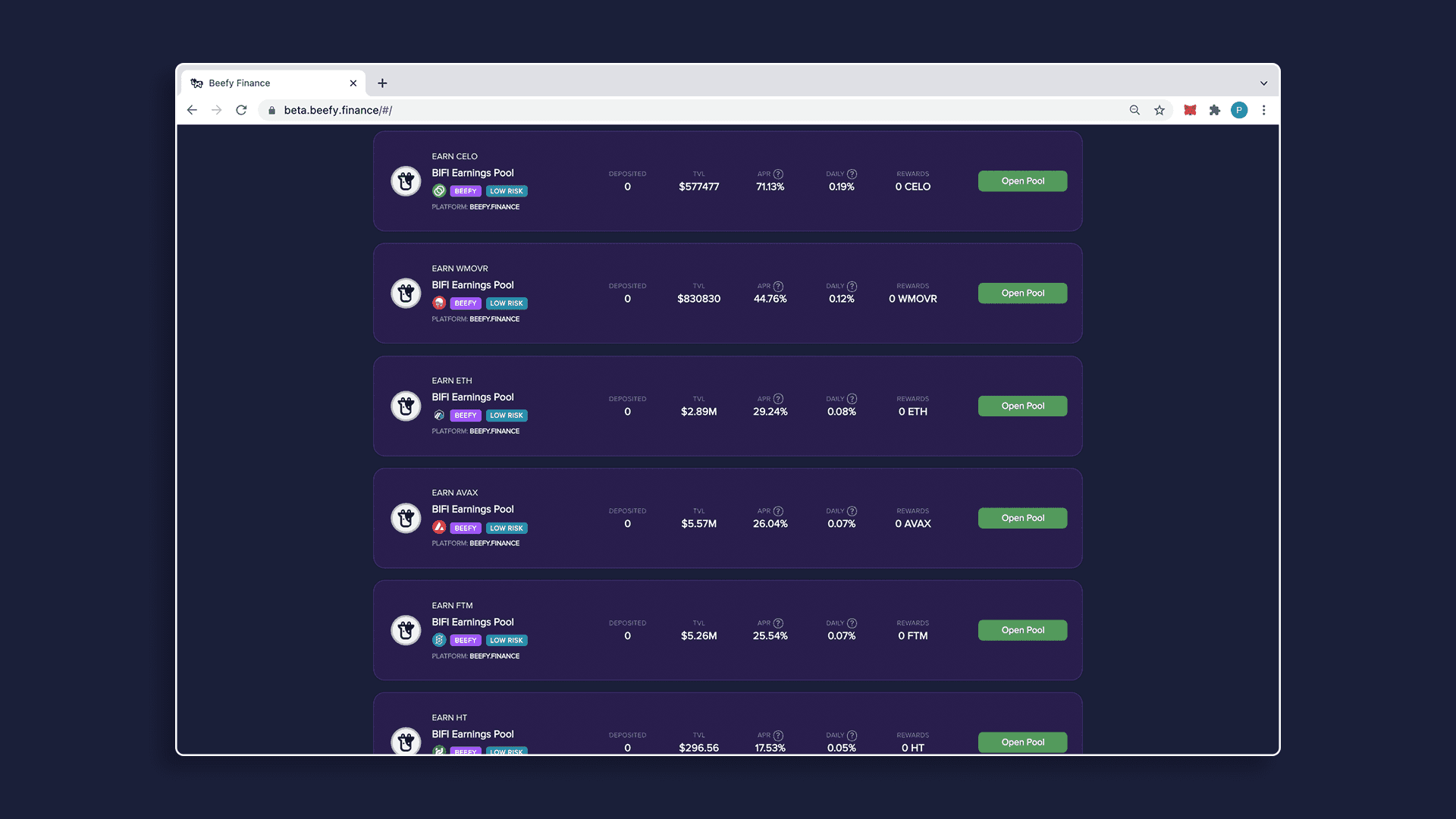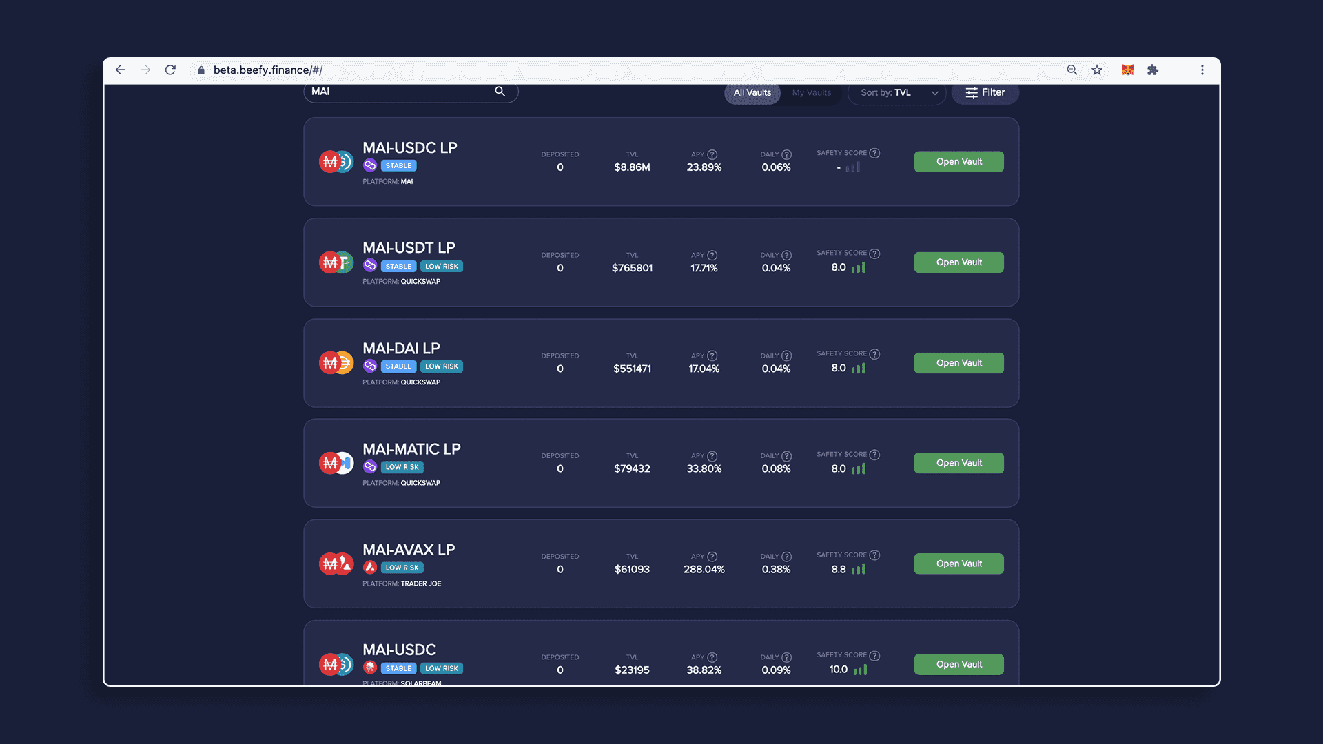 There’s no need to keep switching apps with the new Beefy UI. All vaults are combined into one space and can be browsed no matter the network you’re connected to.