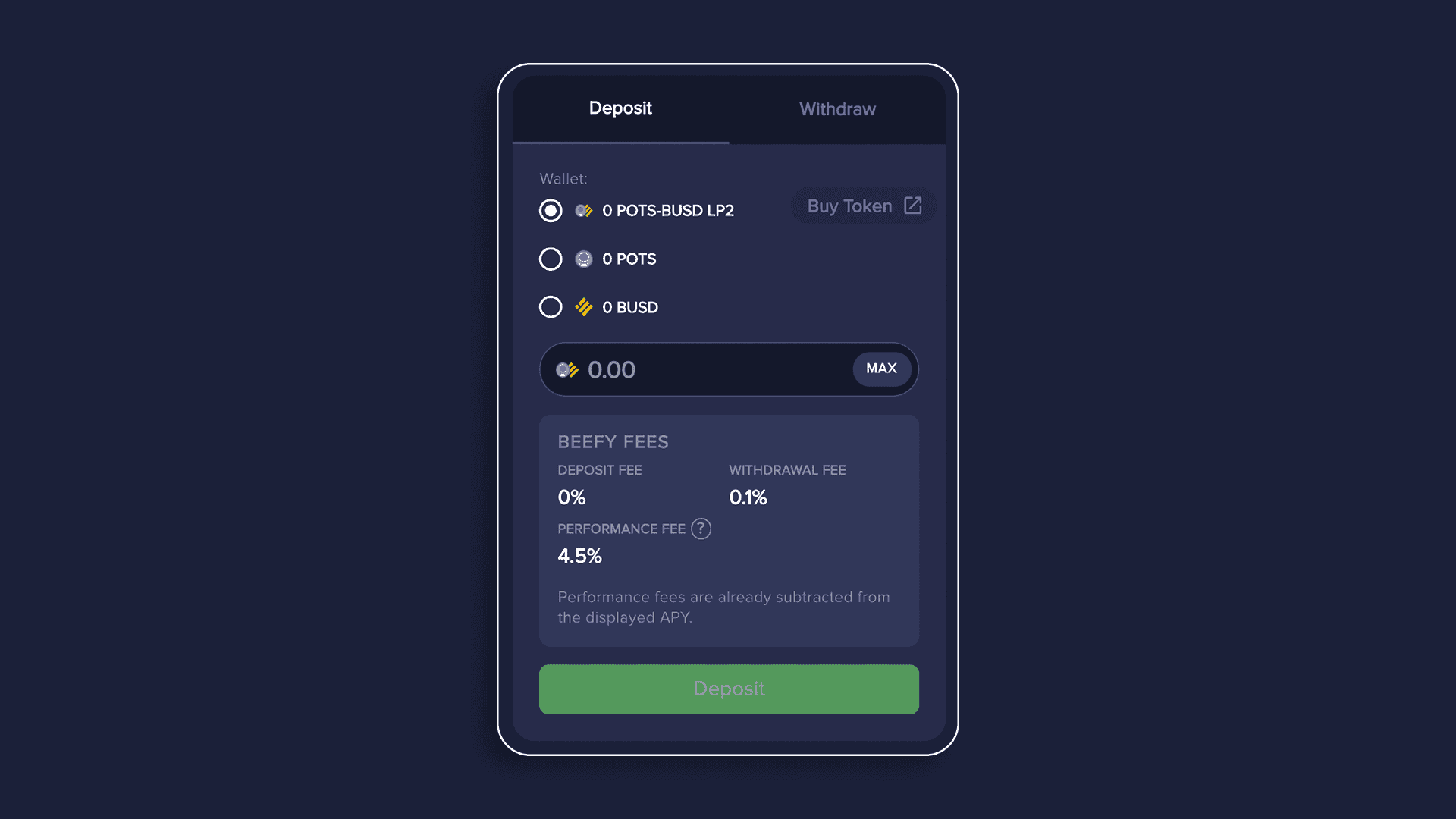 The redesigned Deposit/Withdraw module also displays all the information you need about the vault’s fees. In addition, Beefy ZAP has been redesigned and clearly displays the available options to enter a vault with LP or single tokens.