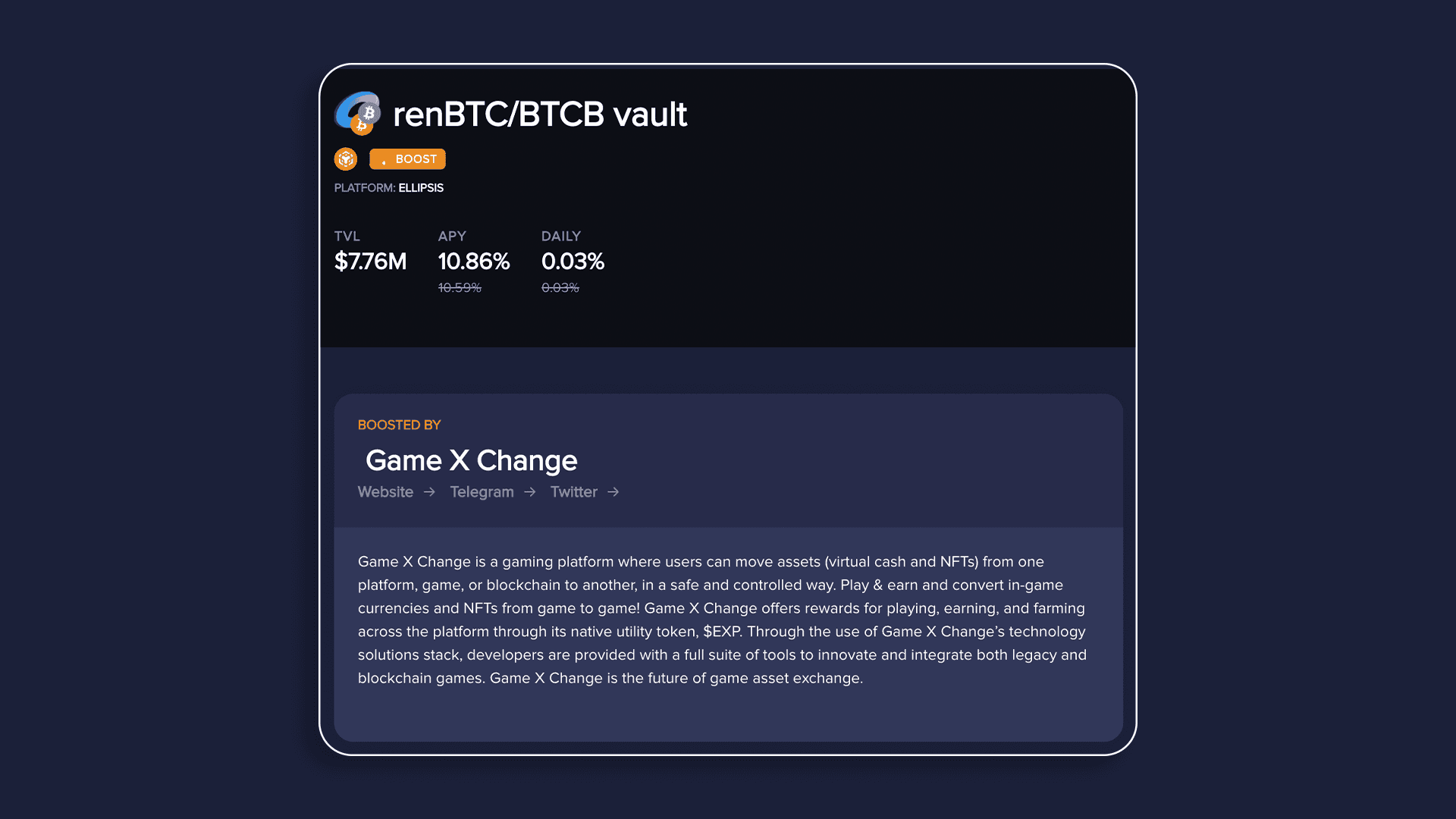 If a vault is currently boosted you will see an extra module added to Deposit/Withdraw section. This will contain info about our Launchpool partner boosting the vault along with a link to their app and socials.