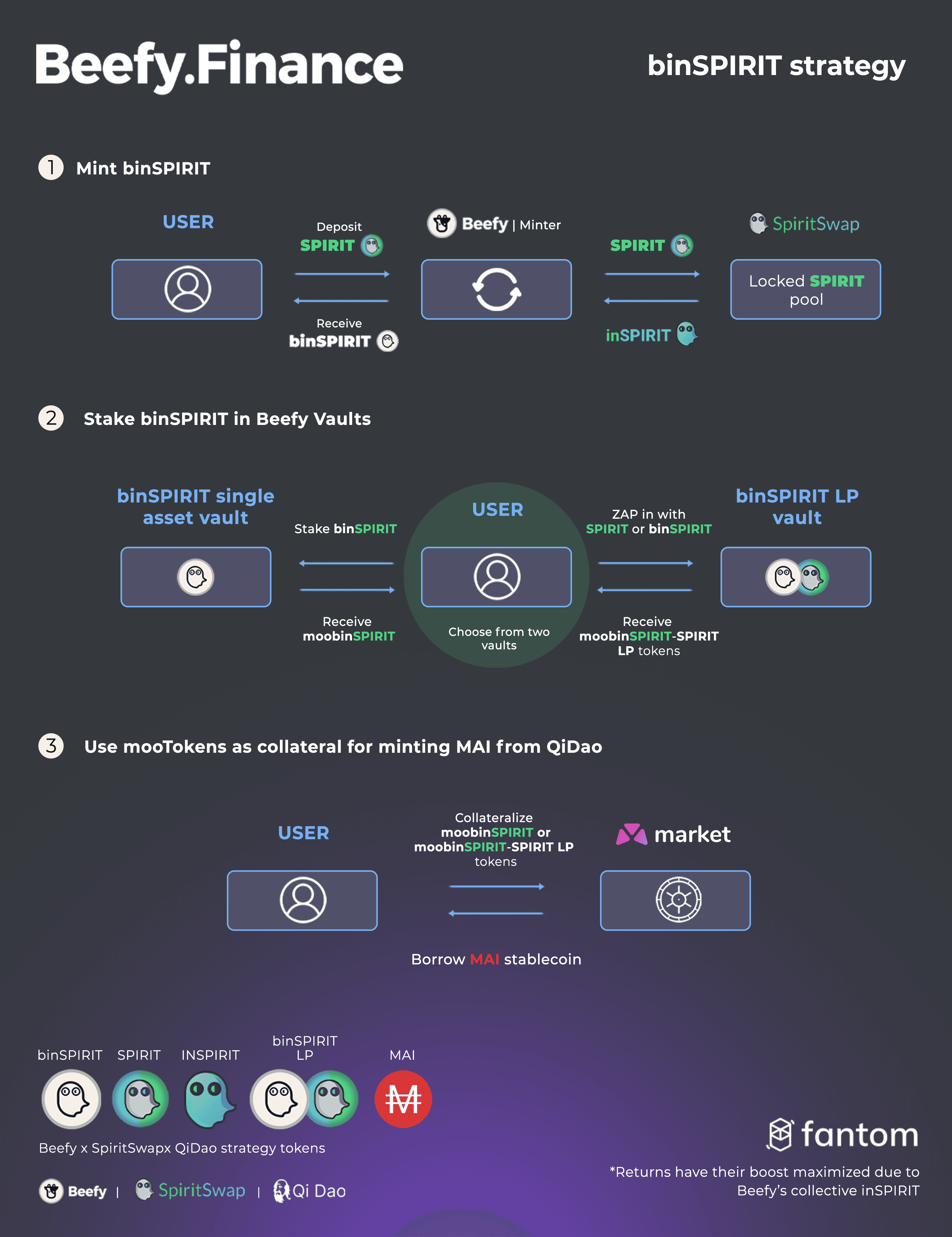 If you’ve decided to deposit your binSPIRIT in a Beefy Vault, you can extract even more value out of them with QiDao. Your moobinSPIRIT and moobinSPIRIT-SPIRIT LP tokens can both be used as collateral for borrowing MAI, QiDao’s stablecoin, via pools on market.xyz. You can read more about the process in our QiDao x Beefy article, as well as explore all our strategies in the infographic below: