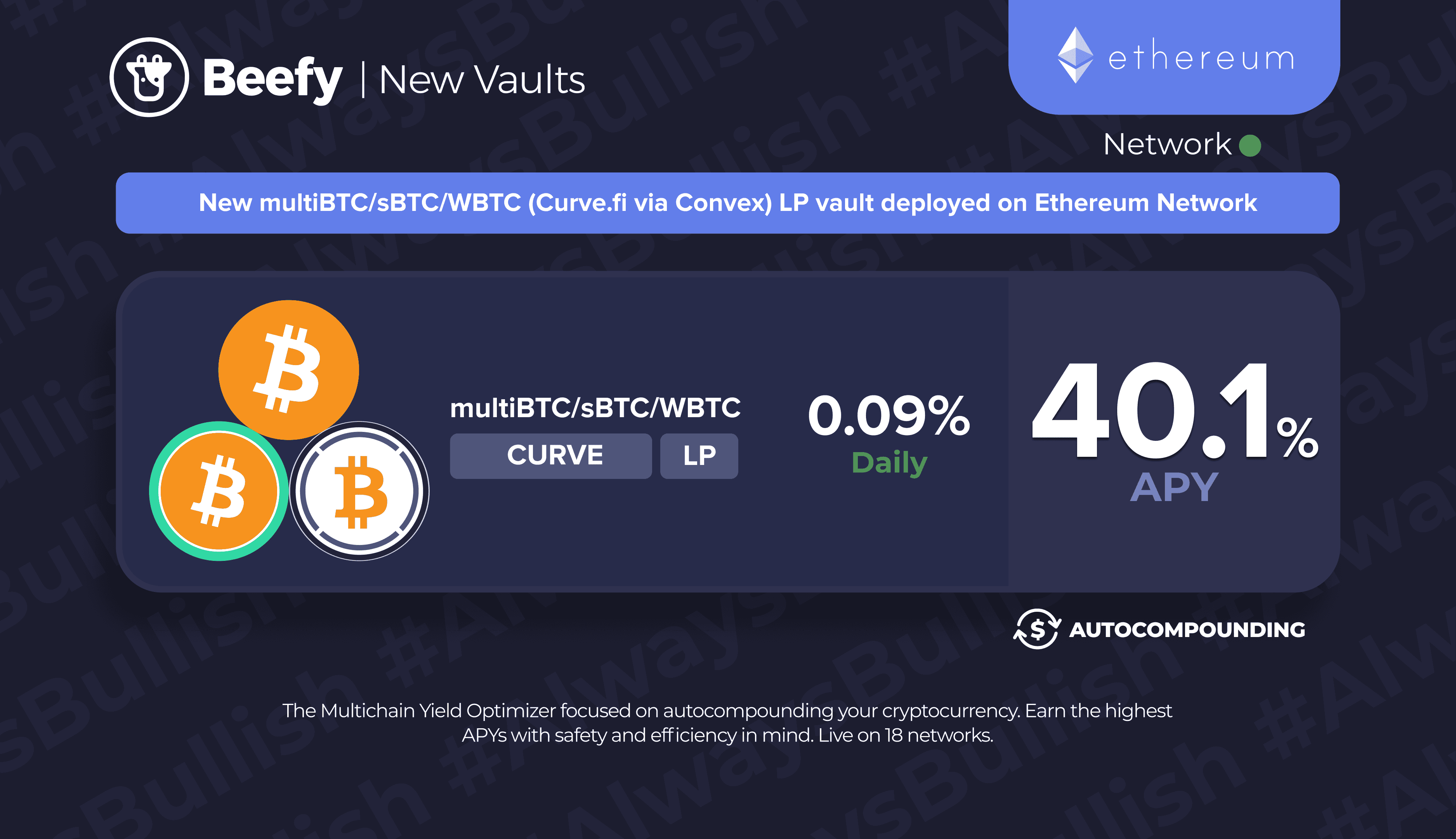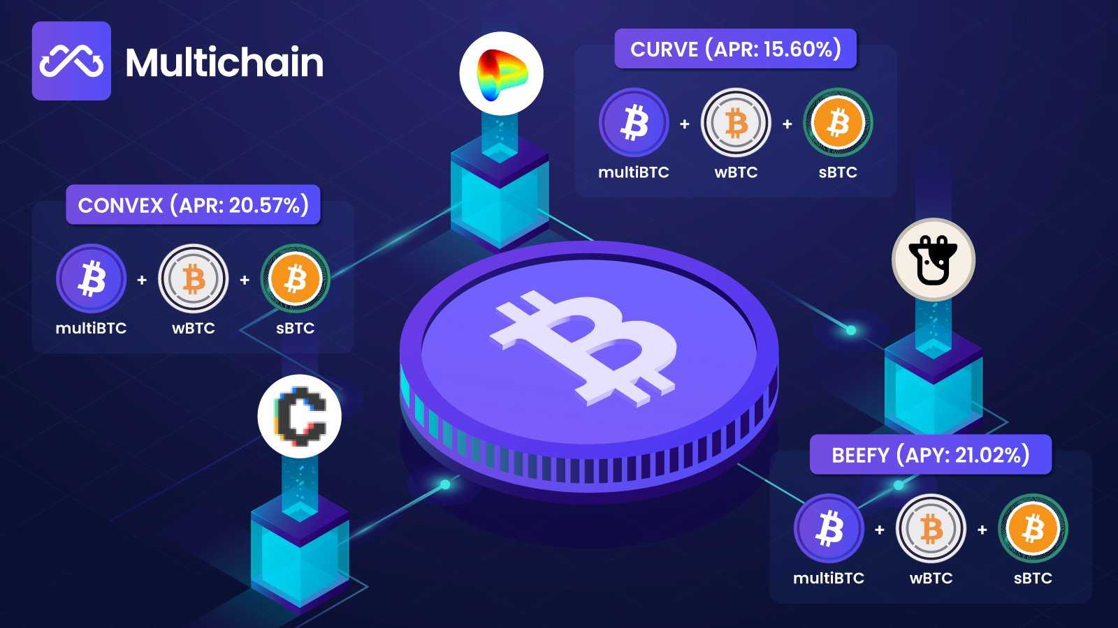 By combining the power of Multichain and multiBTC with Convex’s optimal approach to Curve liquidity rewards and Beefy’s market-leading autocompounding vaults, we can now offer users the highest returns on their BTC from across the industry, coupled with the safety and diligence that our users know and trust.