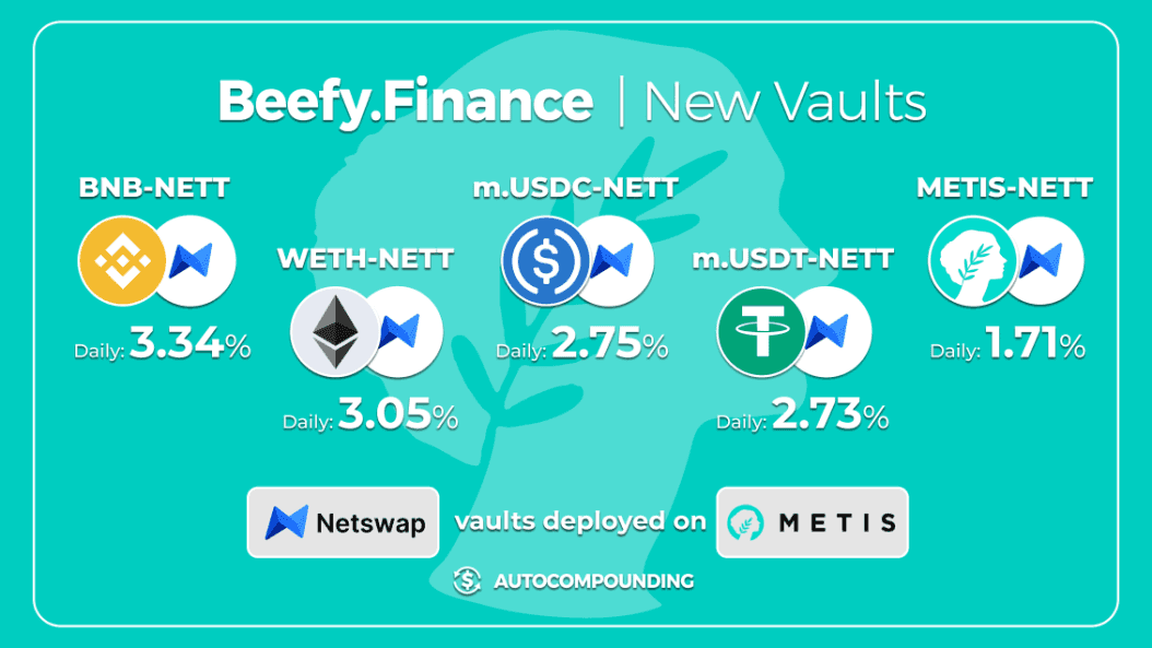 Beefy has launched 11 Netswap Vaults on Metis with more to be added in the future. To start autocompounding and maximizing your Metis gains, just drop your LP tokens into a Vault on Beefy DApp or Zap in with a single asset. You can keep up to date with developments by following @beefyfinance on Twitter.