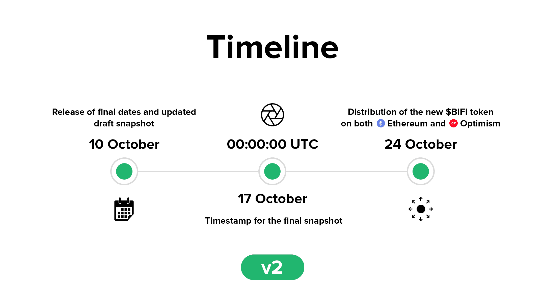 The official snapshot will be captured around 00:00:00 UTC on October 17th (midnight at the end of 16 October). For the avoidance of doubt, specific block numbers for all 20 deployed chains for the old $BIFI token will be used for the snapshot. As most chains do not add blocks each second, in many cases the final block will not be issued at exactly 00:00:00. There is no reliable way to predict the block numbers for each chain in advance, so users are strongly advised not to take actions (e.g. trading) which assume a specific block number for the snapshot.