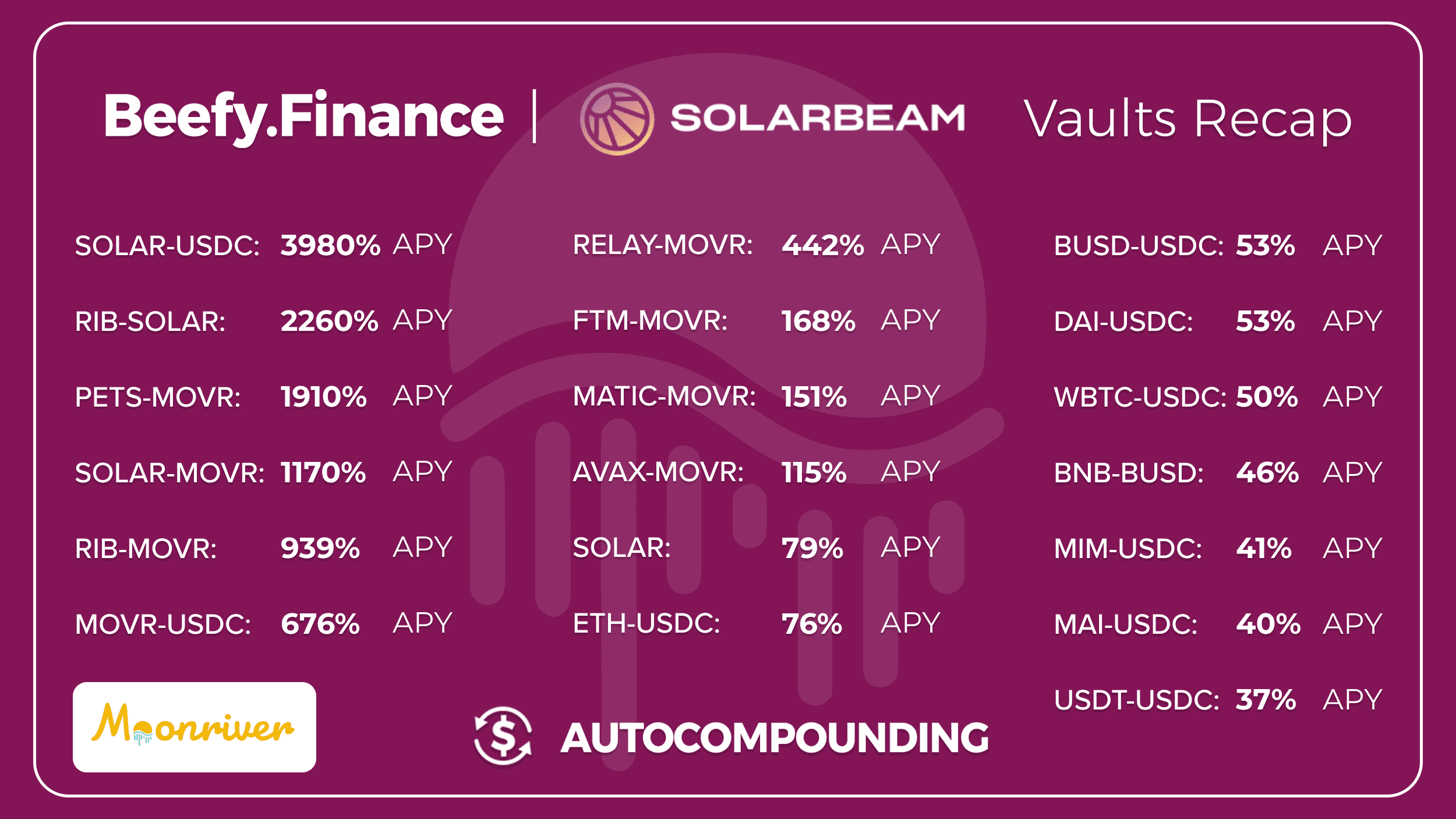 The first vaults we are offering are from Solarbeam AMM. We will add more vaults in the future, so don’t miss out, follow @beefyfinance on Twitter. We have deployed vaults for all types of investors, blue chips, stablecoins, and even degen. If you want your favorite Moonriver platform added to Beefy, head over to our Discord and talk with the team.