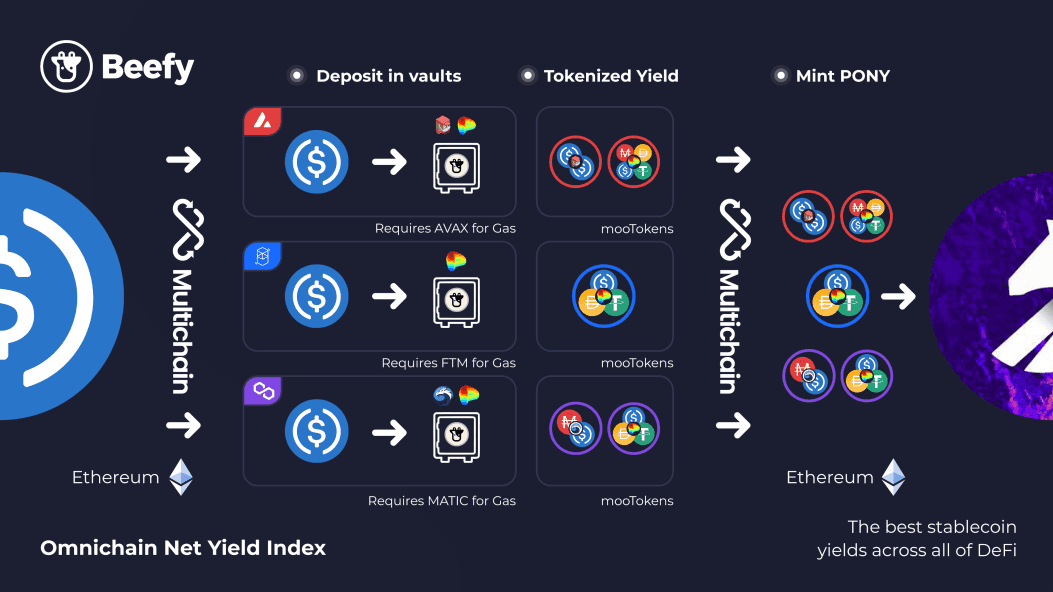 Tuesday, June 28, 2022 – In an industry first, Ethereum users can now gain exposure to Beefy Vaults through Pony Finance’s PONY (Passive Omni-chain Net Yield) Index. Holders of the ERC-20 token $PONY will be able to reap rewards from a basket of fully-collateralized stablecoins across multiple blockchains. Autocompunded interest generated by Beefy stablecoin strategies is then distributed back to $PONY holders staked in the $PONY rewards pool.