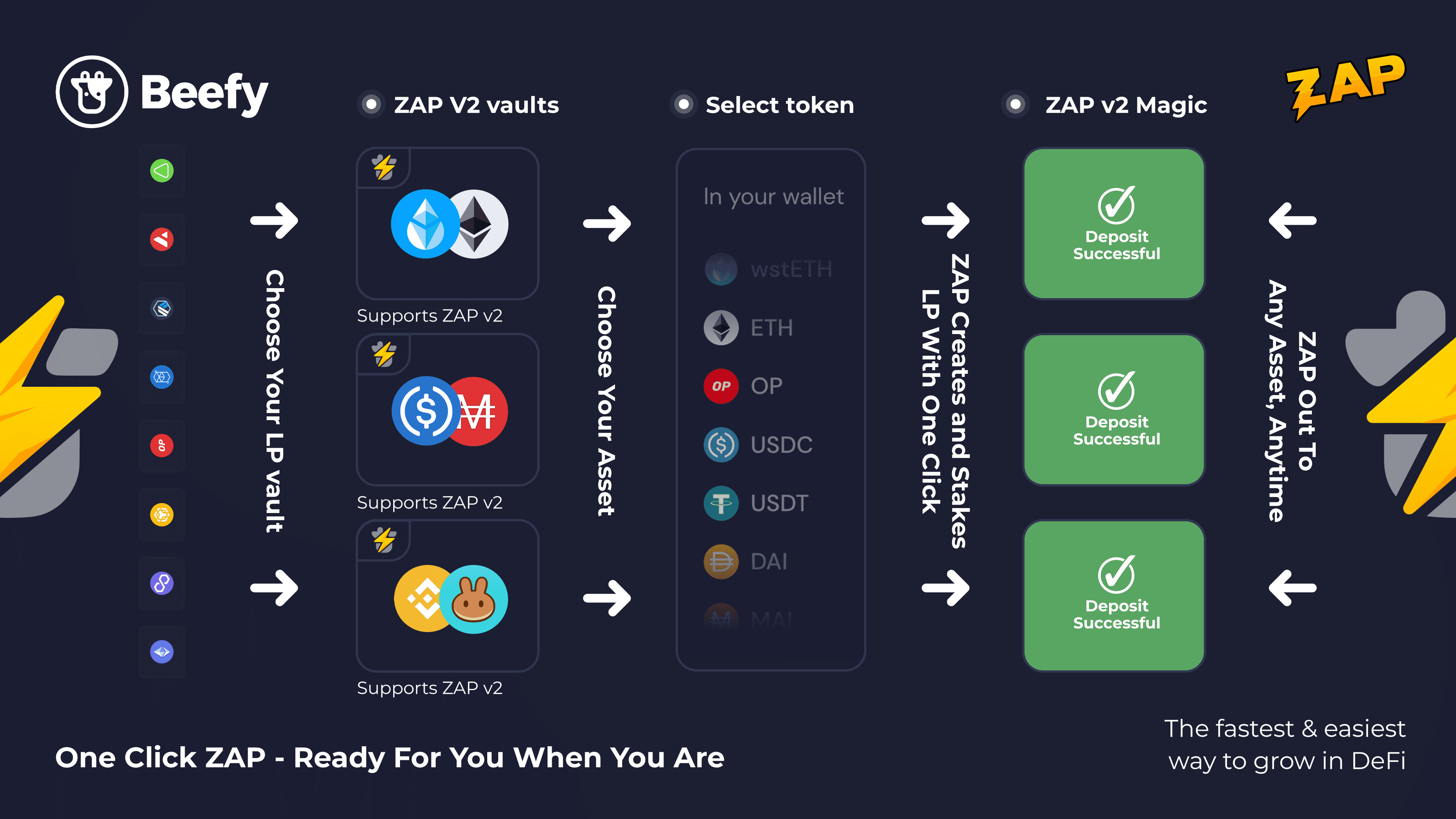 As THE Multichain Yield Optimizer on 18 chains, we at Beefy are all too aware that the joys of autocompounding are guarded by the complexity of building liquidity positions. This is why we invented the Beefy ZAP in May 2021, to allow our users to enter Beefy vaults with just one of the underlying tokens needed for the liquidity pool. Since then, countless users have told us how much they love ZAP, and asked for more.