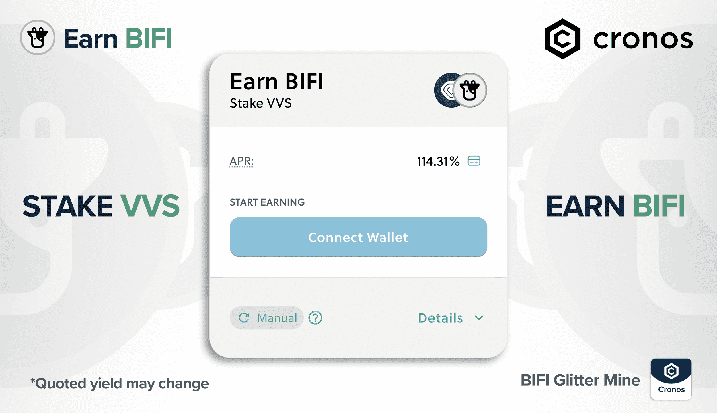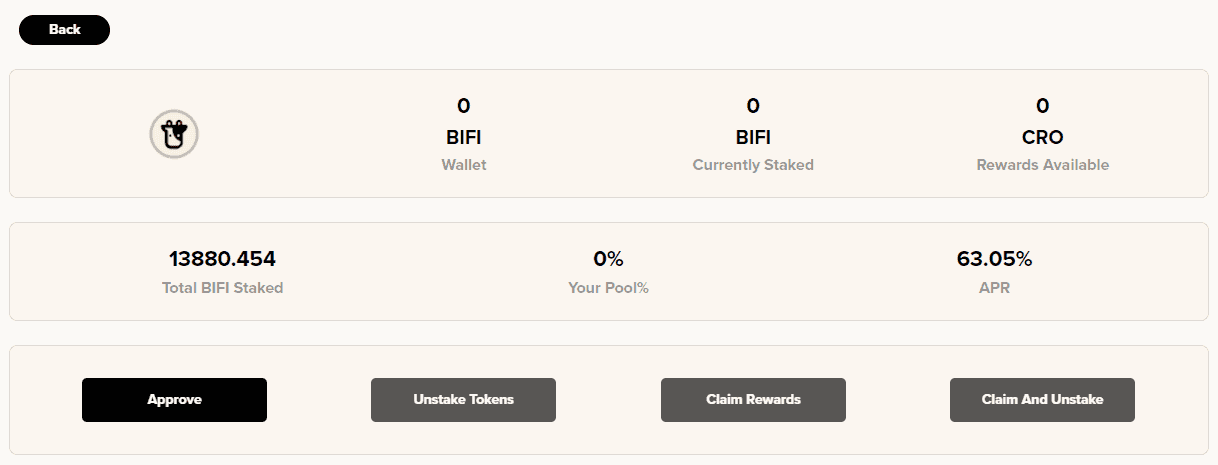On our Beefy Cronos Vaults, you can stake $BIFI with a single click to earn $BIFI rewards.