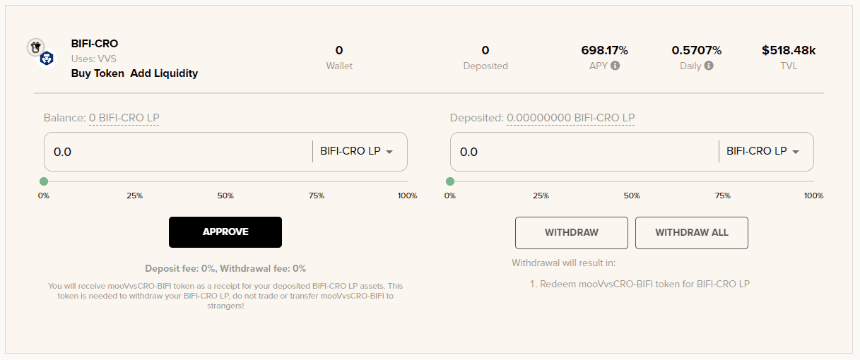You can also use the Zap feature if you only have $BIFI, $CRO, or $WCRO in your Cronos wallet. This lets you enter the vault without needing to manually stake in a liquidity pool. See our Beefy Zap guide for more details.