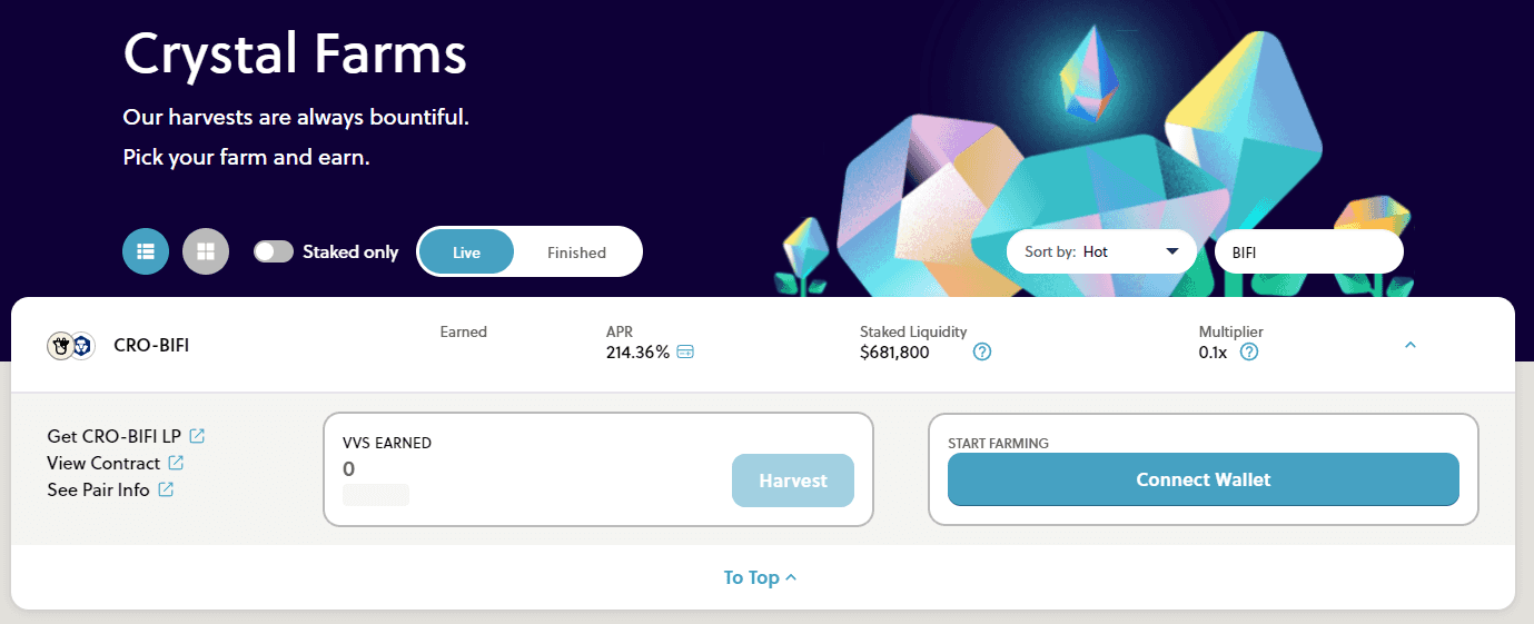2. Open the VVS Finance Crystal Farms, connect your wallet, and stake your $BIFI-$CRO LP tokens from step one. You’ll then earn $VVS rewards you can harvest manually from the Crystal Farm.